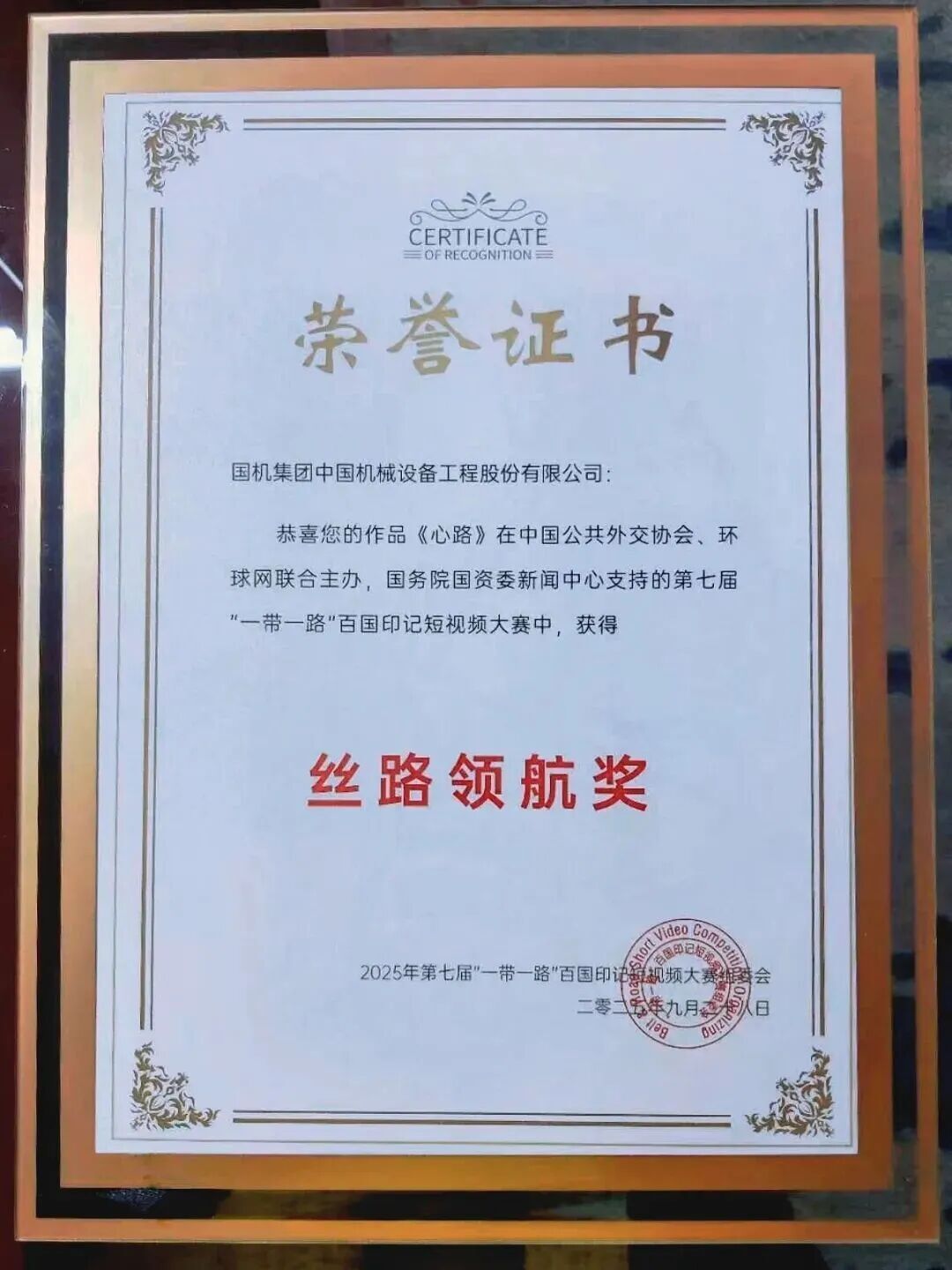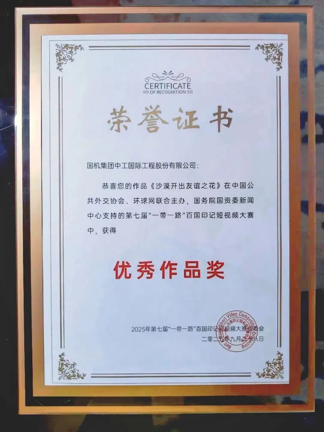 9月28日,由中国公共外交协会主办、国务院国资委新闻中心支持的第七届“一带一路”百国印记短视频大赛 颁奖盛典在广州启幕。在全球百余个国家和地区超千部作品中,国机工程集团2部作品脱颖而出:中工国际报送的《沙漠开出友谊之花》荣获优秀作品奖,中设集团报送的《心路》荣获丝路领航奖 。